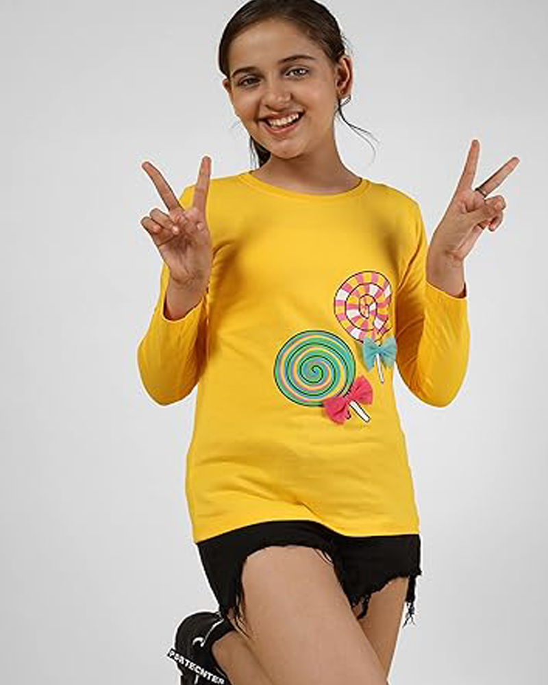 KIDS Girls Cotton Printed Full Sleeve Regular Fit T-Shirt