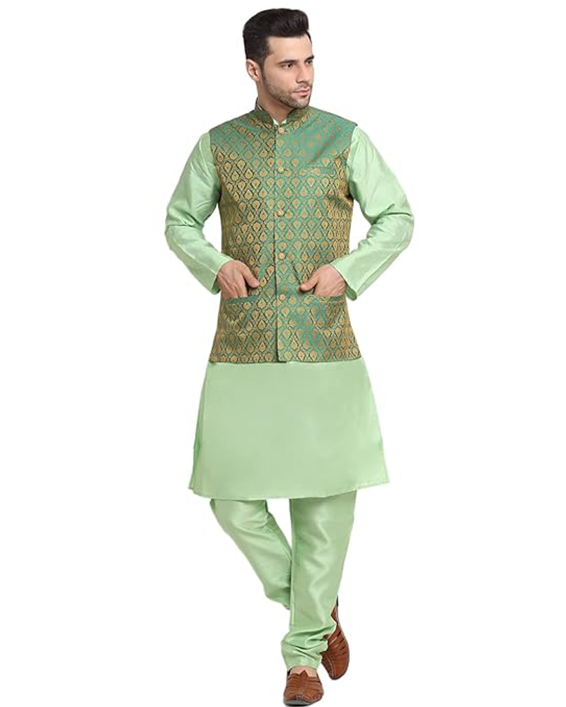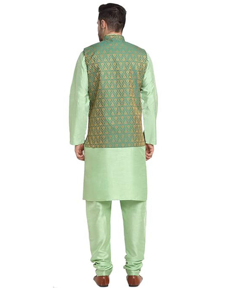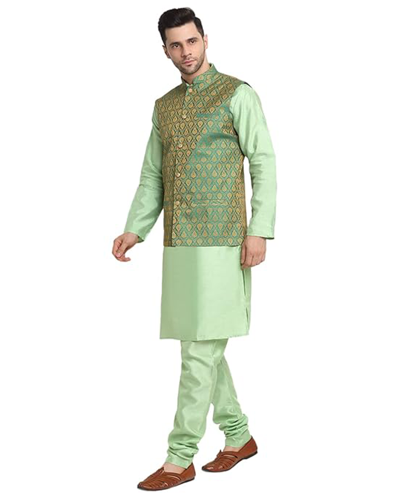 Mens Sea Green Silk Blend Kurta and Churidar Set with Jacquard Paisley Nehru Jacket