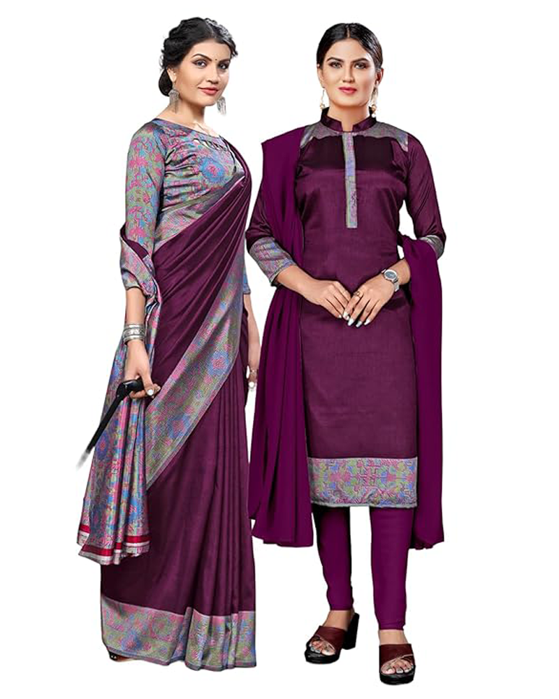 Vimla Women’s Art Silk Uniform Printed Unstitched Salwar Pant with Dupatta Set and Saree Unstitched Blouse Piece | Office Uniform Saree For Women | School Uniform Saree For Teacher | Combo Pack of 2